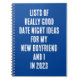 Funny "List Of Really Good Date Night Ideas For" notebook. This is an original quote, "Lists of really good date night ideas for my new boyfriend and I in 2023." Add your favourite quote. Enjoy!