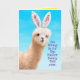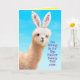 Cute llama wearing bunny ears and saying, "I'm filling in for the Easter Bunny this year. And "llama" tell you, it ain't easy... I ended up hiding all the eggs in my stomach." Funny Easter card for the animal lover.
