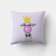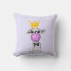 A pillow with a whimsical llama blowing a pink bubble while chewing gum. Wearing a gold crown and a black bow tie. Light purple background.