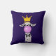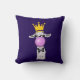 A pillow with a whimsical llama blowing a pink bubble while chewing gum. Wearing a gold crown and a black bow tie. Light purple background.