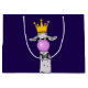 A gift bag with a whimsical llama blowing a pink bubble while chewing gum. Wearing a gold crown and a black bow tie. Dark purple background.