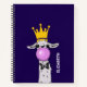 Spiral notebook with a whimsical llama blowing a big pink bubble. Wearing a gold crown and a black bow tie. Dark purple background. Personalise with a name.