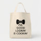 This is a Funny Personalised Grocery Tote Bag Gift Idea: Mr. Good Lookin' Is Cookin'. Design features a modern typography font, bowtie accent and a custom name.