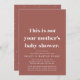 Modern times call for a modern baby shower invitation. If you're taking the party online due to social distancing, this is a perfect invitation for you. The bold playful text reads "This is not your mother's baby shower" with an emphasis on not, and the party details below include room for online social meeting information, registry, shipping info and more along with the party details. The back features a coordinating playful dot pattern. The modern mauve colour is default, but it can be changed by clicking "customise further." Great for co-ed showers, adoption showers and two dad or two mum couple showers too - and anyone who appreciates your sense of humour and wit!