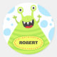 Cute and fun, personalised name stickers featuring a happy, green, striped monster or alien cartoon with customisable text on a yellow, whimsical oval with an orange dot border on his belly. Add your name or other text. The monster is happy and looks like he is cheering. Bright and colourful design for kids, great as property labels or bookplates for little boys and girls. Other coordinating products are available.