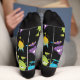 Fun crew socks with a black background and lots of silly monsters in yellow, blue, purple, red, and green!