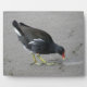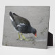 This awesome plaque features a photograph of a Moorhen, a pretty water bird with a distinctive yellow-tipped red beak found in Great Britain. This funny individual appears to be taking a bow, but is actually pecking at some crumbs on the ground.