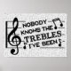 Funny pun poster for musicians and music teachers : Nobody knows the trebles I've seen | The design shows a treble clef with music notes and is made in all black and grey