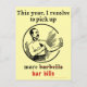 This humourous New Year postcard for fans of beer or other alcohol shows a vintage fighting man with his fists up like he's boxing. Instead, he's holding a bottle and a slip of paper. The text says, "This year, I resolve to pick up more [barbells] bar bills," with "barbells" crossed out. The man wears a cool moustache and has a real look of resolution on his face.