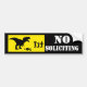 Funny no soliciting sign bumper sticker, perfect to stick on your front door! Yellow warning sign holds a tyrannosaurus rex silhouette with stick figures running away in terror, and a (poor?) unfortunate solicitor has been chewed up. Darn. Awesome twisted humour gets its point across.