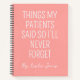 Keep every hilarious, touching, or unforgettable patient quote safe in this personalised nurse notebook that says “Things My Patients Said So I’ll Never Forget.” A perfect blend of humour and heart for nurses, doctors, medical assistants, and healthcare workers. Great for jotting notes during shifts or as a thoughtful gift for coworkers, nursing students, or graduates. Ideal for birthdays, nurse week, or hospital appreciation days. Customise with a name or title for a truly special touch!