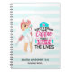 Spiral notebook with a humourous saying: First i drink the coffee, then I save the lives. Perfect for nurses. Featuring an illustration of a female nurse wearing a cute old fashioned nursing hat and carrying a giant hypodermic needle. Light blue and white striped background.