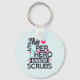 A keychain with a cute and comical saying. Typography text says: This superhero wears scrubs. Designed with a light blue stethescope and a big pink heart and a pink heart monitor line. A light blue background with faded pink polka dots.