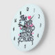 A clock with a cute and comical saying. Typography text says: This superhero wears scrubs. Designed with a light blue stethescope and a big pink heart and a pink heart monitor line. A light blue background with faded pink polka dots.