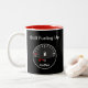 Funny office coffee mug two side design with an automotive theme fuel gauge measuring how much coffee you've had with one side full and the other side empty in a cool red and black two tone style. A humourous novelty gift for a coworker or treat yourself to the fun. Makes a great executive gift.