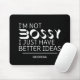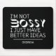 This mousepad is perfect for all the ambitious women out there. If you're the type of person who's always bursting with great ideas, then you need this mousepad on your desk. It boldly declares, "I'm not bossy I just have better ideas," setting the tone for your workday. It also makes for a perfect gift for your friend or colleague who has the same take-charge attitude. It's sure to bring a smile to their face and a sense of humour to their workspace. Whether you work in an office or from home, this funny mousepad is an excellent way to showcase your confidence and let everyone know who's in charge.