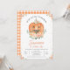Sweet rustic little pumpkin first birthday invitation featuring a cute orange smiling pumpkin and lovely watercolor peach colored floral arrangements. This little pumpkin birthday invitation is a sweet way to invite guests to an autumn or fall pumpkin themed girls first birthday party.