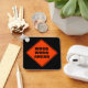 A classic orange diamond caution road sign warns of wood work ahead in a thick black sans serif font. Perfect gift for a carpenter or woodworker, a pun play on words of a classic sign, road work ahead. Personalize this item by adding a name on the back.