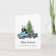Funny Panda in Blue Vintage Van Christmas Greeting Card. Watercolor drawing of a cute white panda bear in a blue vintage truck and Christmas tree. Personalised text.