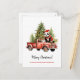 Funny Panda in Red Retro Van Xmas postcard. Watercolor drawing of a cute white panda bear in a red vintage truck and Christmas tree. Personalised text.