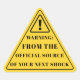 A bold, funny birthday warning sticker designed as a yellow caution triangle, featuring the phrase “From the official source of your next shock.”