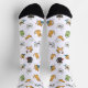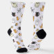 This is a whimsical and charming pattern featuring a variety of adorable cartoon dogs and cats scattered across a clean white background. The pets are illustrated in a simple, hand-drawn style with bright colors and playful expressions, showcasing different breeds and activities (like a cat playing with yarn or a dog wearing a tiny cape). The pattern is shown applied to a pair of crew-length socks with black heels and toes. This design is perfect for animal lovers who enjoy a touch of fun and humor in their apparel.