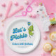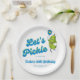 Fun paper plates for your next pickleball party. Design features a funny cartoon pickle holding a Pickleball Paddle and a cool font that reads "Let's Pickle" Easily add your custom text and change the background colour. Great for an adult or kid's pickleball birthday party, pickleball weekend gathering, getaway, pickleball club party or everyday fun. Pickleball - the best sport ever!!