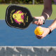 Personalise this fun women's pickleball paddle with your name showing a whimsical bright yellow chick wielding a pickleball paddle along with a feminine hot pink sunburst in the background. A contrasting black background makes the design pop with style. Personalise with your name.