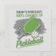 Funny pickleball "Today's forecast: 100% chance of pickleball" design depicts a pickleball paddle and ball. This simple pickleball design makes a nice gift for the pickleball addict in your life.