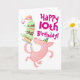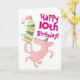 A happy pig on a birthday card. Use "Personalise this template" and change the age to create a unique, customised card. A card featuring a gleeful pig, beneath a teetering layer cake with lashings of green icing and topped with pink candles.