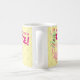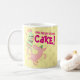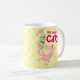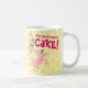 A happy pig on a mug. Use "Personalise this template" to tweak the "Coffee, your daily excuse for CAKE!" text and create a unique, customised gift; text changes are reflected on both sides. A mug for a cake and coffee lover, featuring a gleeful pig, beneath a teetering layer cake with lashings of green icing and topped with pink candles.