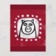 A cute drawn pig in black and white over a red textured background surrounded with white dots.