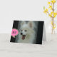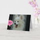Cute and funny photo of a white Pomeranian puppy with mouth open wide and the shout out- Hi! on a greeting card with customisable text inside. © Little Wing Photo & Design