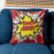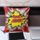 The pillow boasts a bold, comic book-style caption, "Punch Here," adorned in an exaggerated, action-packed comic style font that seems to leap off the fabric, reminiscent of a comic strip's dynamic energy. The background bursts with explosive lines, representing motion and impact, typical of comic book illustrations, adding an extra layer of visual pizzazz to your space.