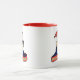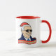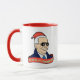 Both sides of this political holiday humour ceramic handled coffee mug are identical and feature a cartoon of president elect joe biden in sunglasses, a deep blue overcoat, a gleaming smile, and a santa hat.