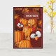 A graphic illustration of a pumpkin patch with cartoon roosters on a custom greeting card. The card has text templates for your personalisation. Original artwork: Copyright Charmaine Paulson