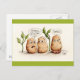 Funny Pun about Potatoes. A drawing of three potatoes. The first asking: Why are we called potatoes? We don't have toes. The 3rd one has big feet with big toes and says: Speak for yourselves. Lime green background border.