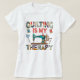 A cute and colourful design for any sewing lover, quilter or crafter. Design features the phrase, "Quilting is my therapy" in a colourful font resembling a quilt pattern along with a sewing machine and quilting supplies such as scissors and spools of thread. This shirt would make the perfect gift for that special quilter in your life.