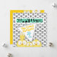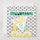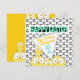 With four cartoon, crazy eyed chickens, on a black and white chicken foot print background in front and another four crazy chickens peeking-in, on a yellow background on the back, this one is just so much fun!