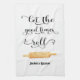 Black and White Kitchen Towel with Funny Quote Let the Good Times Roll in Typography and rolling pin illustration. Personalise with your own text. Housewarming Gift, New Home Gift.