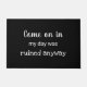 Welcome your guests with this whimsical black and white door mat featuring the words "come on in my day was ruined anyway" in modern typography and let them decide if they want to enter!