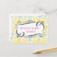 A postcard with a funny humourous quotation. When life gives you lemons, add vodka. The saying is set inside a fancy whimsical frame. The background is a quaint and cute pattern composed of yellow lemons and pastel blue flowers in a hand drawn illustrated style.