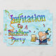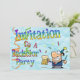 Crumpled light blue paper as a background with wordart in rainbow colours decorated with paper streamers in orange and green inviting the gang to a bachelor party. To top it all there´s a comical cartoon guy wearing a party hat and holding a stein full of beer, with more streamers flying around him. A fun design for a happy occasion.