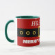 Funny red Christmas Santa Claus suit and belt coffee mug. Custom x-mas cup with fun outfit design and seasons greeting. Red or custom colour background with bold typography template. Fun Holiday party supplies and accessories. Make your own party favour gifts and table decorations for winter Holiday gathering or dinner party. Holiday gift ideas for employees, teacher, coach, co worker, boss, friend, neighbours, family, brother, sister, mum and dad, relatives, company staff, office personnel, business partner, corporate meeting, etc. Personalise with name or fun quote.