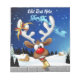 A Funny cartoon reindeer with a bright red nose and large white antlers, adorned with a red and gold bow, peeks through an open window. Outside, a snowy landscape with silhouetted pine trees and a small, glowing house is visible under a dark blue, star-filled night sky. Santa's sleigh pulled by reindeer is flying in the distance. The scene evokes a festive and whimsical Christmas atmosphere. Original Vector Art Copyright BluedarkArt TheChameleonArt.
