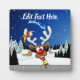 A Funny cartoon reindeer with a bright red nose and large white antlers, adorned with a red and gold bow, peeks through an open window. Outside, a snowy landscape with silhouetted pine trees and a small, glowing house is visible under a dark blue, star-filled night sky. Santa's sleigh pulled by reindeer is flying in the distance. The scene evokes a festive and whimsical Christmas atmosphere. Original Vector Art Copyright BluedarkArt TheChameleonArt.