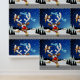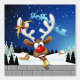 A Funny cartoon reindeer with a bright red nose and large white antlers, adorned with a red and gold bow, peeks through an open window. Outside, a snowy landscape with silhouetted pine trees and a small, glowing house is visible under a dark blue, star-filled night sky. Santa's sleigh pulled by reindeer is flying in the distance. The scene evokes a festive and whimsical Christmas atmosphere. Original Vector Art Copyright BluedarkArt TheChameleonArt.