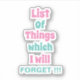 Funny Reminder for Forgetful People Don't Forget Square Sticker with a funny reminder quote - List Of Things which I will FORGET !!! Attention all forgetful folks! Time for a sticky reminder to never forget the unsung hero of labelling and organising: the square sticker! So, next time you're trying to keep track of things or add a touch to your belongings, don't forget your trusty square stickers! They're the secret thing for the forgetful and the creatively inclined. Stick it, label it, and conquer the world, one square at a time!