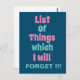 Funny Reminder for Forgetful People Postcard with a funny reminder quote - List Of Things which I will FORGET !!!
