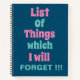 Simple lined white notebook for notes, to do lists, and more with a funny reminder quote - List Of Things which I will FORGET !!!